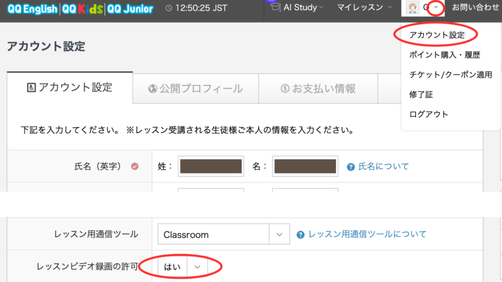 QQ Englishのアカウント設定には「レッスンビデオ録画の許可」という項目があります。ここがオフになっていると、録画の履歴が表示されません。