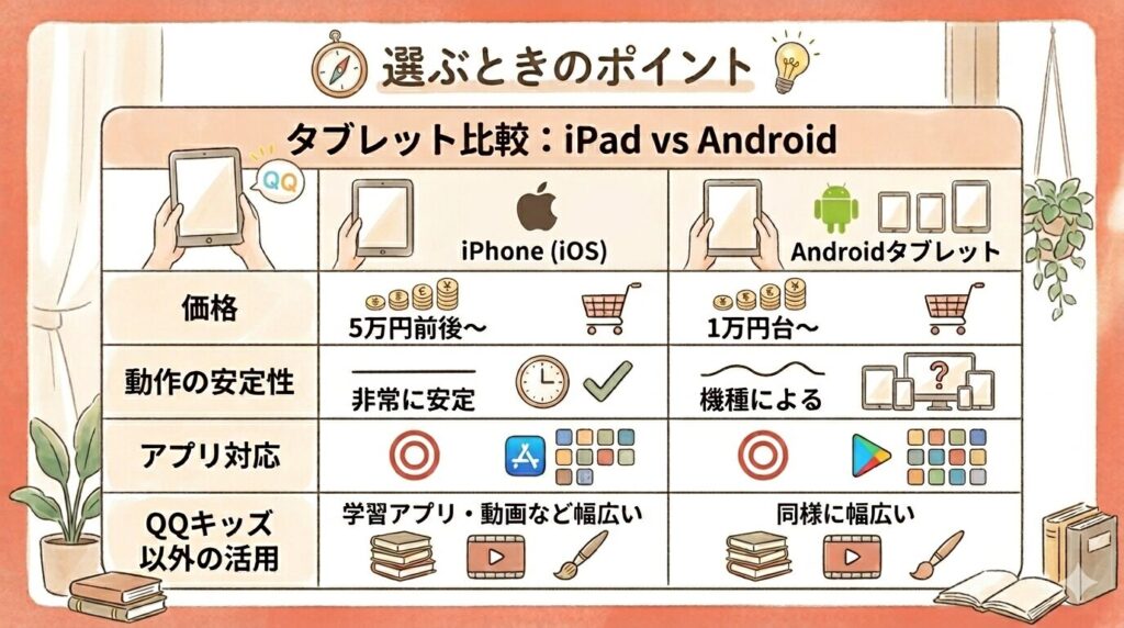 iPadは動作が安定していて安心感がありますが、価格は高めです。QQキッズのためだけに買うにはちょっと贅沢かもしれません。