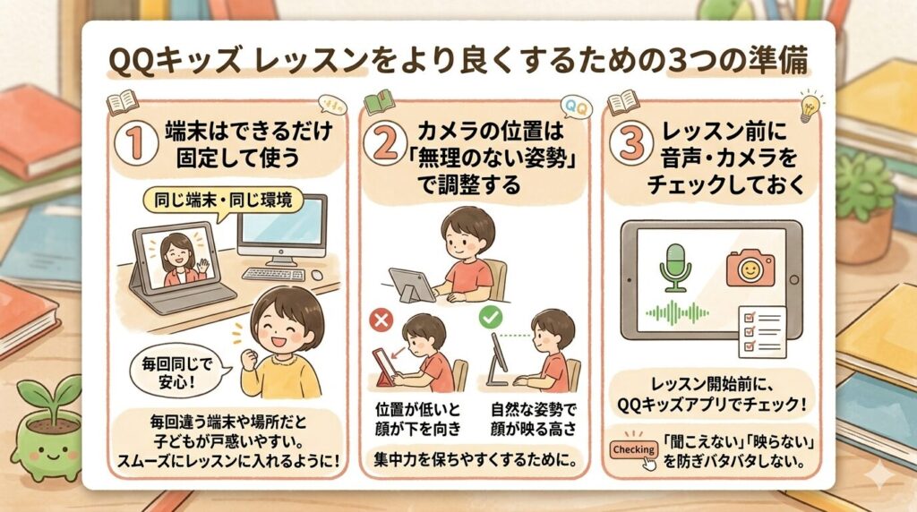端末選びも大切ですが、ちょっとした工夫だけでQQキッズのレッスンはかなり快適になります。