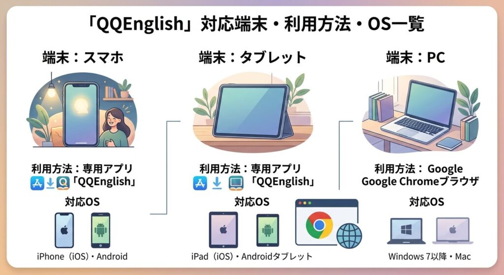 - QQキッズはスマホ・タブレット・PCすべてに対応している